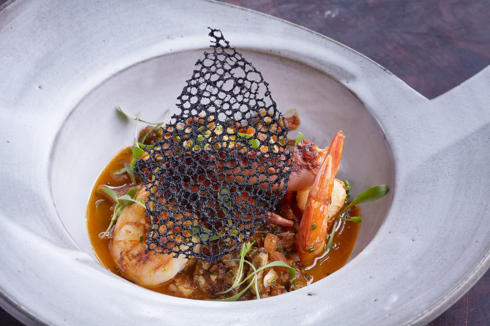Only correct; bread too crispy; fish too salty. Chocolate dessert too sweet impossible eat all.